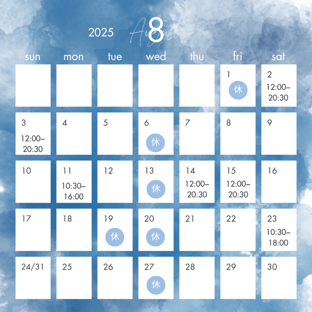 毎度のごとくお知らせが遅くなりすみません。8月の営業予定です。